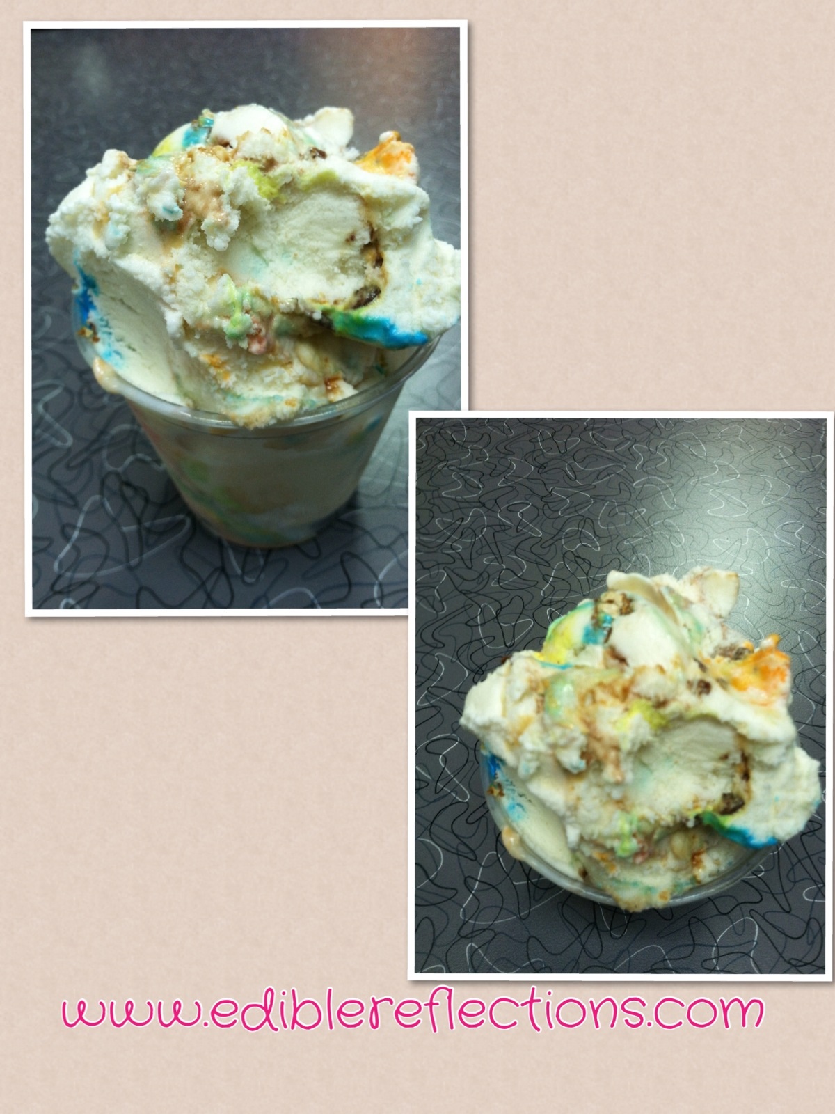 Now lets talk about the stars of the evening. I had The Elvis (bright pink) in a homemade waffle cone. My husband had the Pic-a-nic (Baby Ruth, Milky Way, Heath bar, M&Ms and other stuff) in a cup. My daughter had the peanut butter chocolate in a homemade waffle come. Of course this was a whole lot more than she could handle. So I offered to help her. It’s tough being a mom 🙂 My son of course enjoyed scoops from everyone.