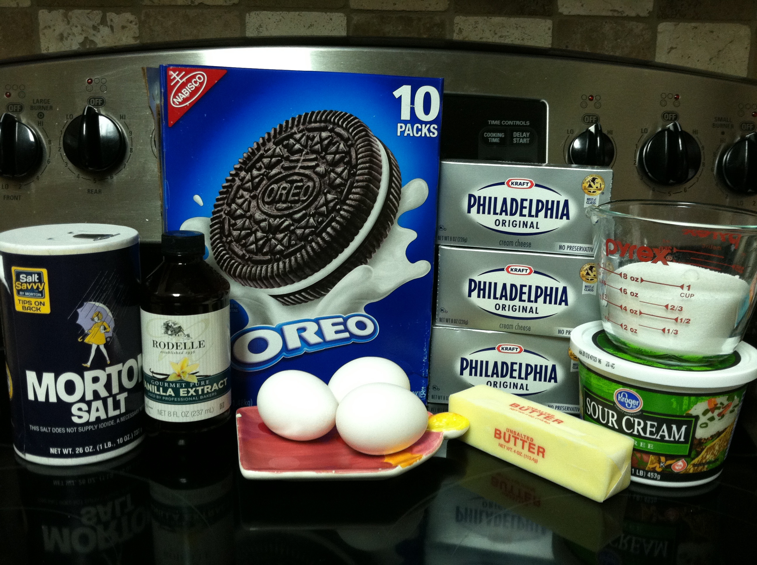 - Make the filling: in a large bowl with electric mixer on medium speed, beat cream cheese and sugar until well blended. Scrape the sides and bottom and blend until uniform. Best in sour cream, vanilla and salt. Scrape the sides and bottom and blend again. Add eggs one at a time, beating well. Stir in chopped Oreo cookies and fold with a flexible spatula.