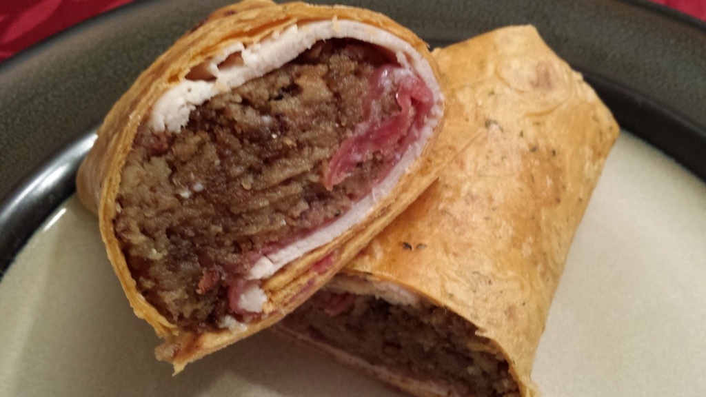 Well here’s the last of our sausage stuffing from Thanksgiving. Pretty much this is a “throw it together burrito”. I emphasize the tortilla wraps because it’s a healthier alternative to sliced bread. Though I know I killed it with the stuffing.