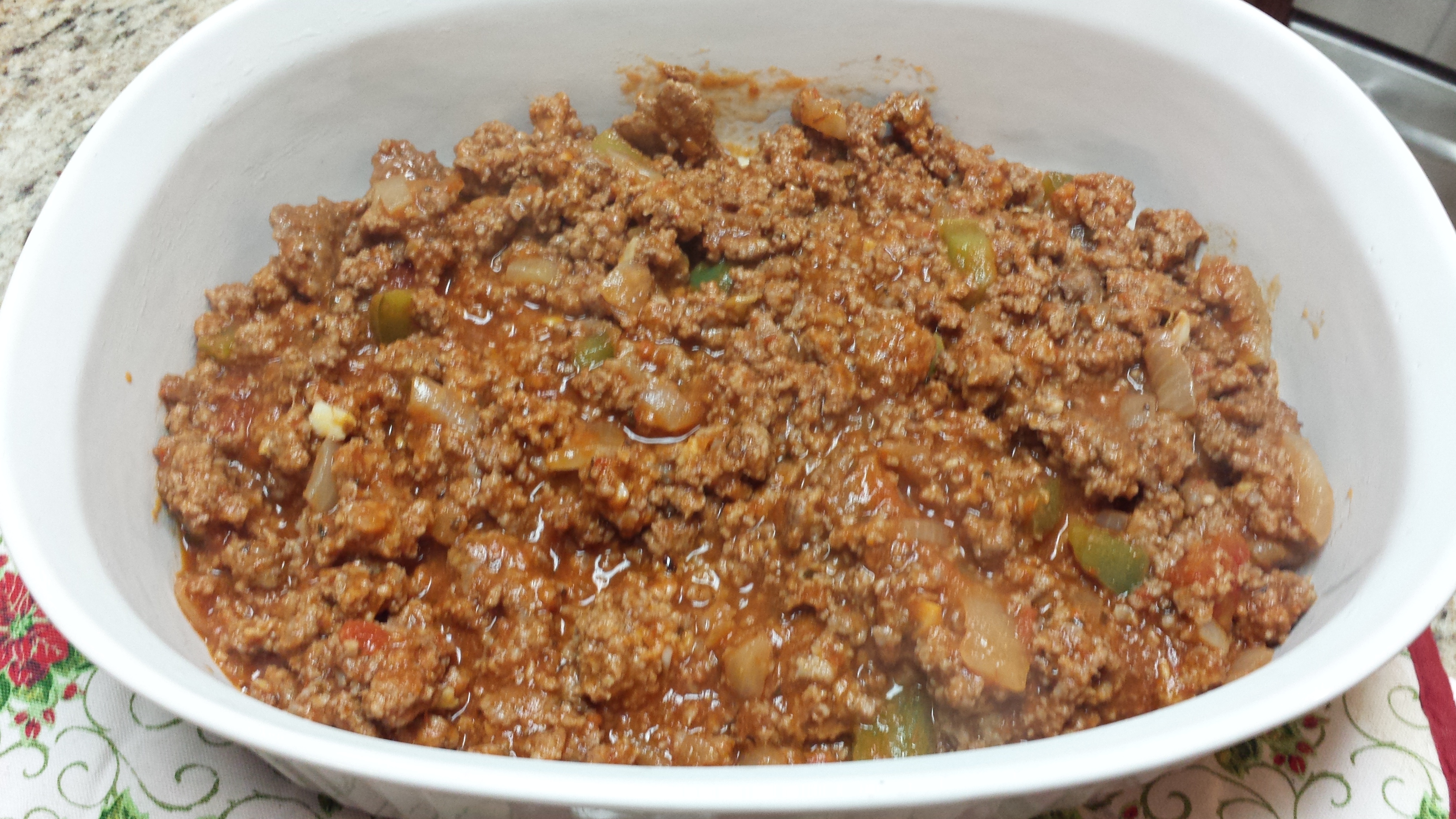 6- Once meat and pasta are ready, spread a layer of meat sauce at the bottom of the pan.