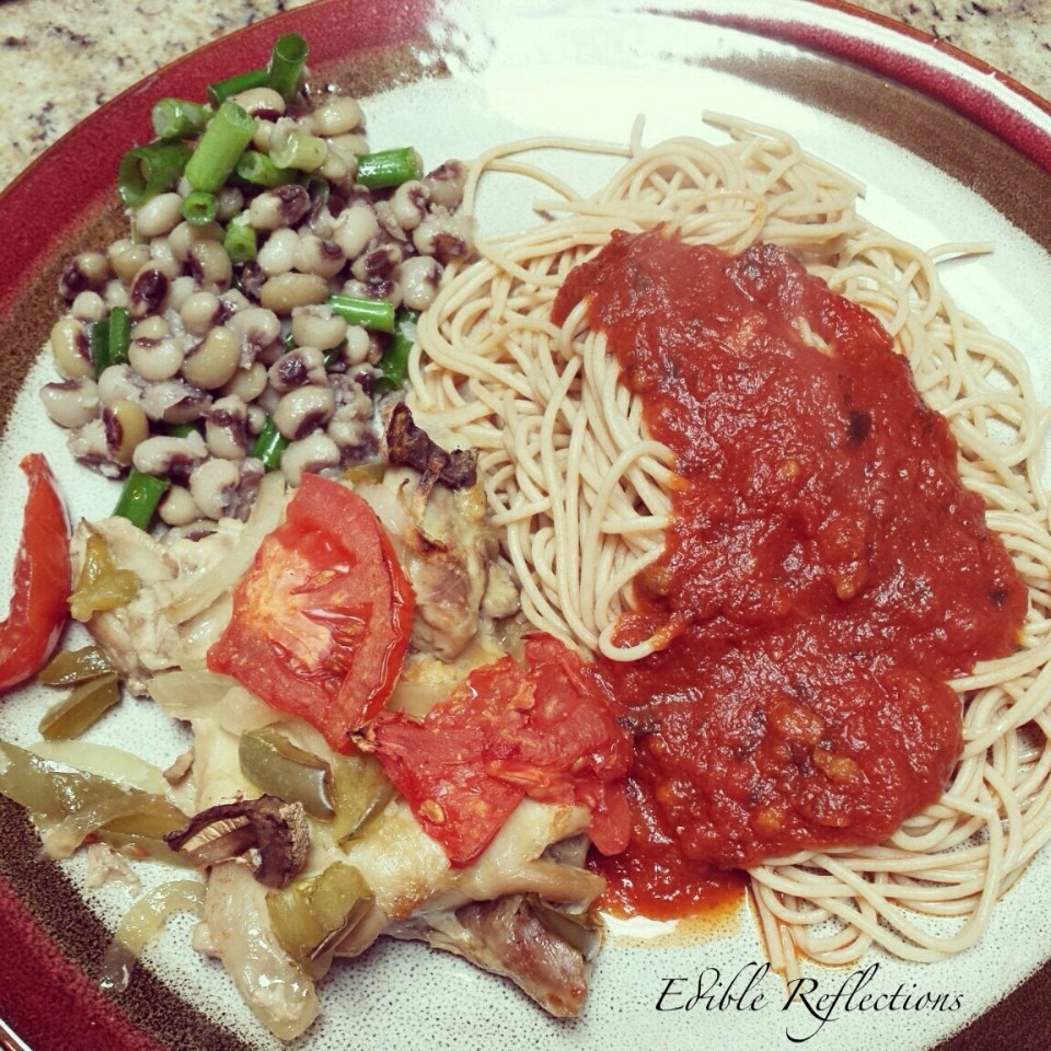 Chicken veggies with angel hair pasta and black-eyed peas salad.